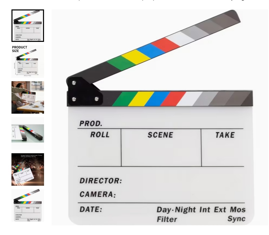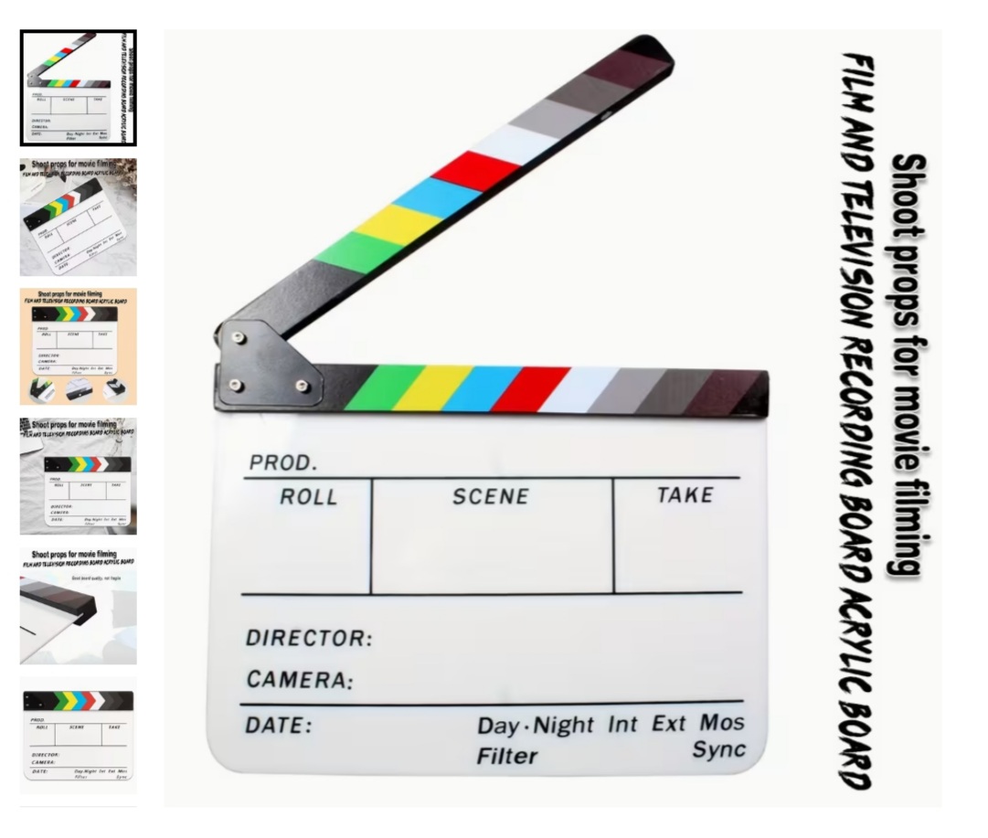 Tableau de marquage en acrylique pour réalisateurs, conçu pour la coupe des scènes d'action, avec planches pour studios de photographie et productions vidéo. Ce tableau effaçable à sec comprend des barres de couleur et est parfait pour les fêtes sur le thème du cinéma.